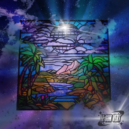 Vitrail illustrant un paysage paradisiaque avec une boule disco dans le ciel, représentant l'album "Clubbing Paradis" de Le Son Vert.